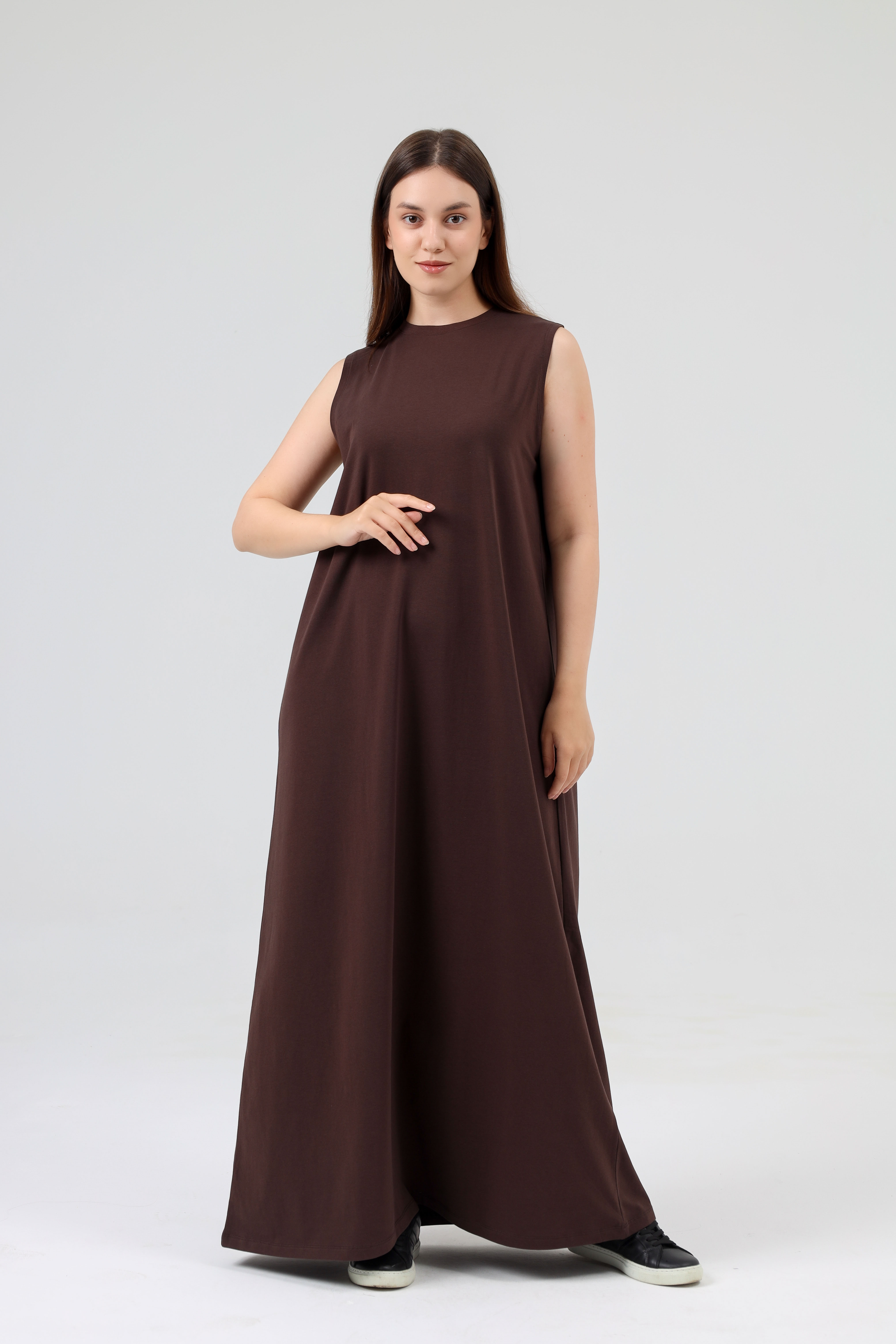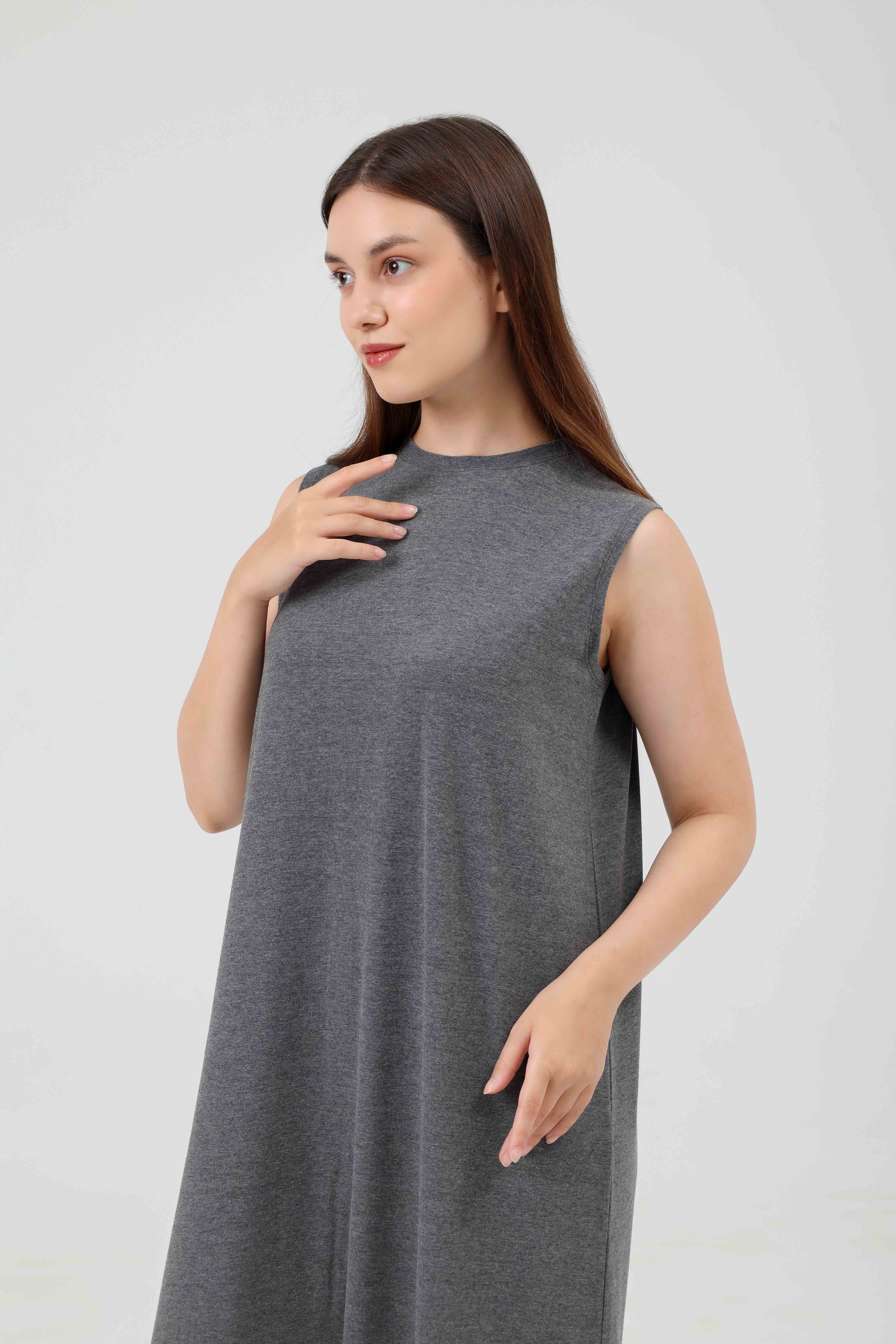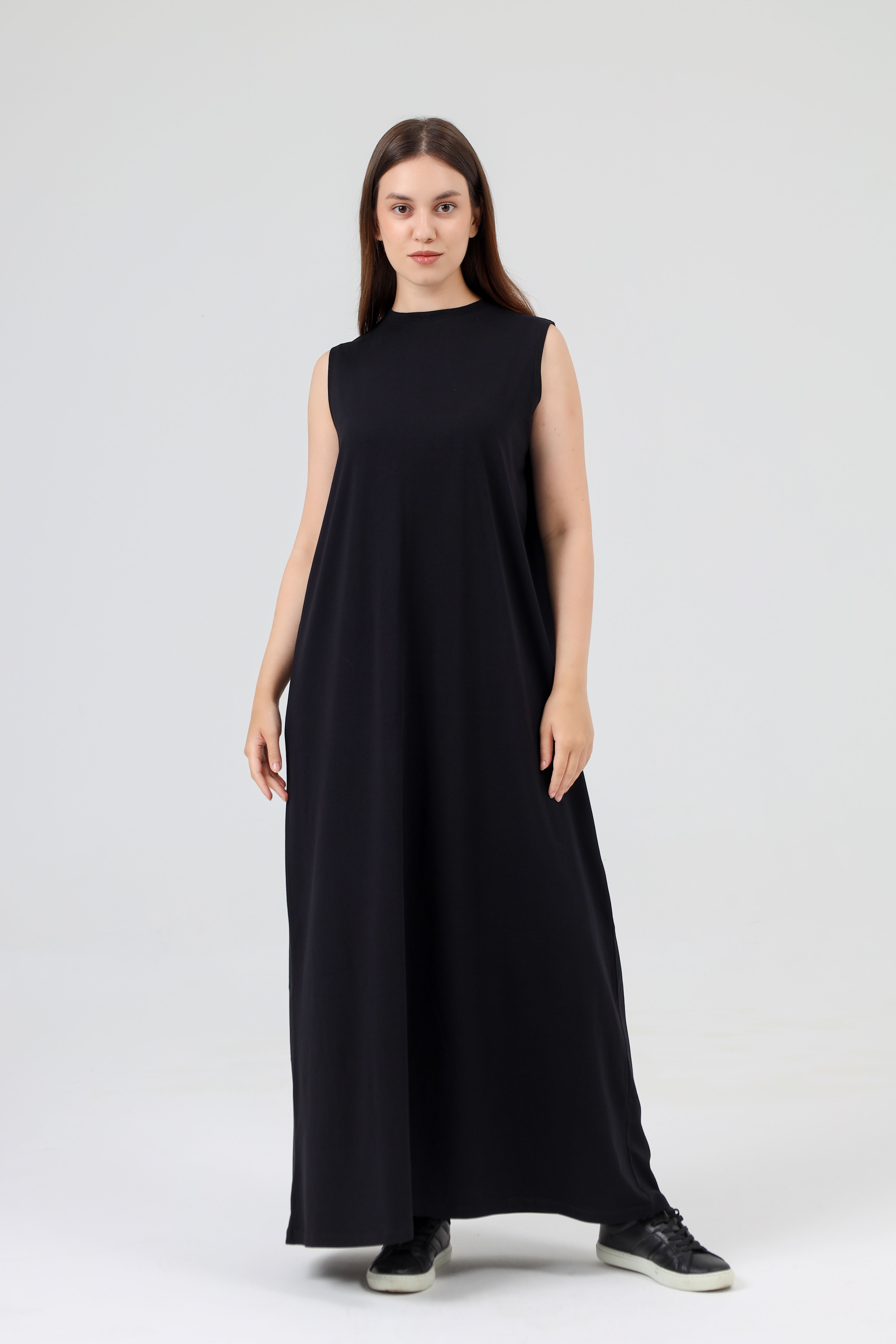 Kadin kolsuz yuvarlak yaka çan elbise. Yumusak dokulu 1. sinif materyel. Kumas: Likrali koton. Mukemmel uyum kalibi. Luks kalite dikis. Manken olculeri: boy 175 cm, 89 cm, 67 cm, 99 cm